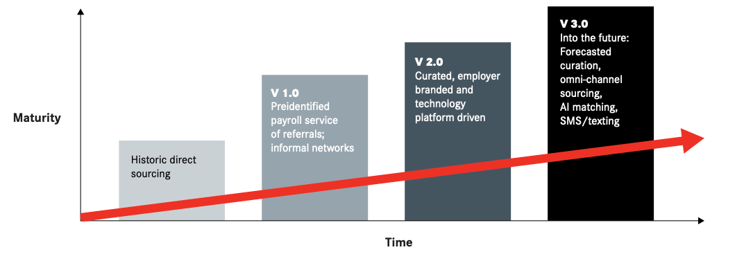 - Version 3.0: Forecasted curation of talent pools from omni-channels, and advanced practices (e.g. AI matching, SMS/texting).