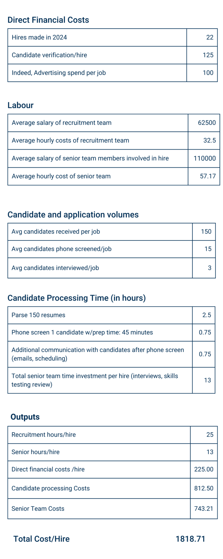 *if you have a dedicated recruitment team whose salary/comp can be totally allotted to the recruitment function, use their salary/% time spent on recruitment/number of hires instead (so 1 employee at 62500/year at 50% = 31250/22, or $1420/hire at 22 hires per year)