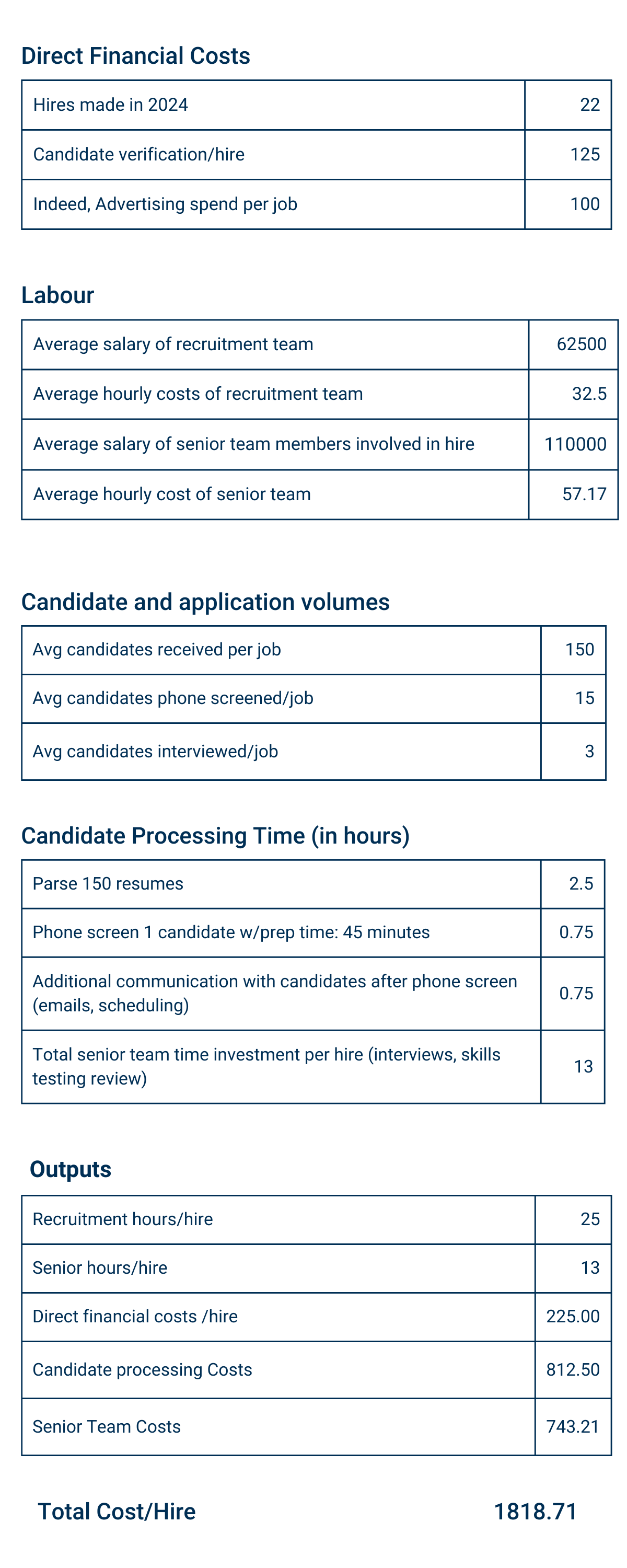 The above estimate is very conservative—it doesn’t include the costs of onboarding, the risks of turnover, and assumes that the recruitment team works with perfect efficiency on every hire with no downtime. In reality that probably won’t happen, and your real costs would be higher.
