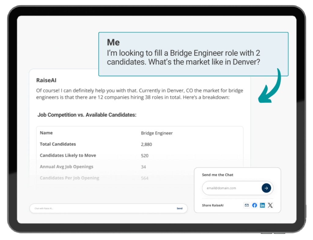 We’ve released a zero-barrier AI advisor we call RAI. Its specialty is delivering actual market intel for US jobs that you can use to manage internal and candidate expectations.